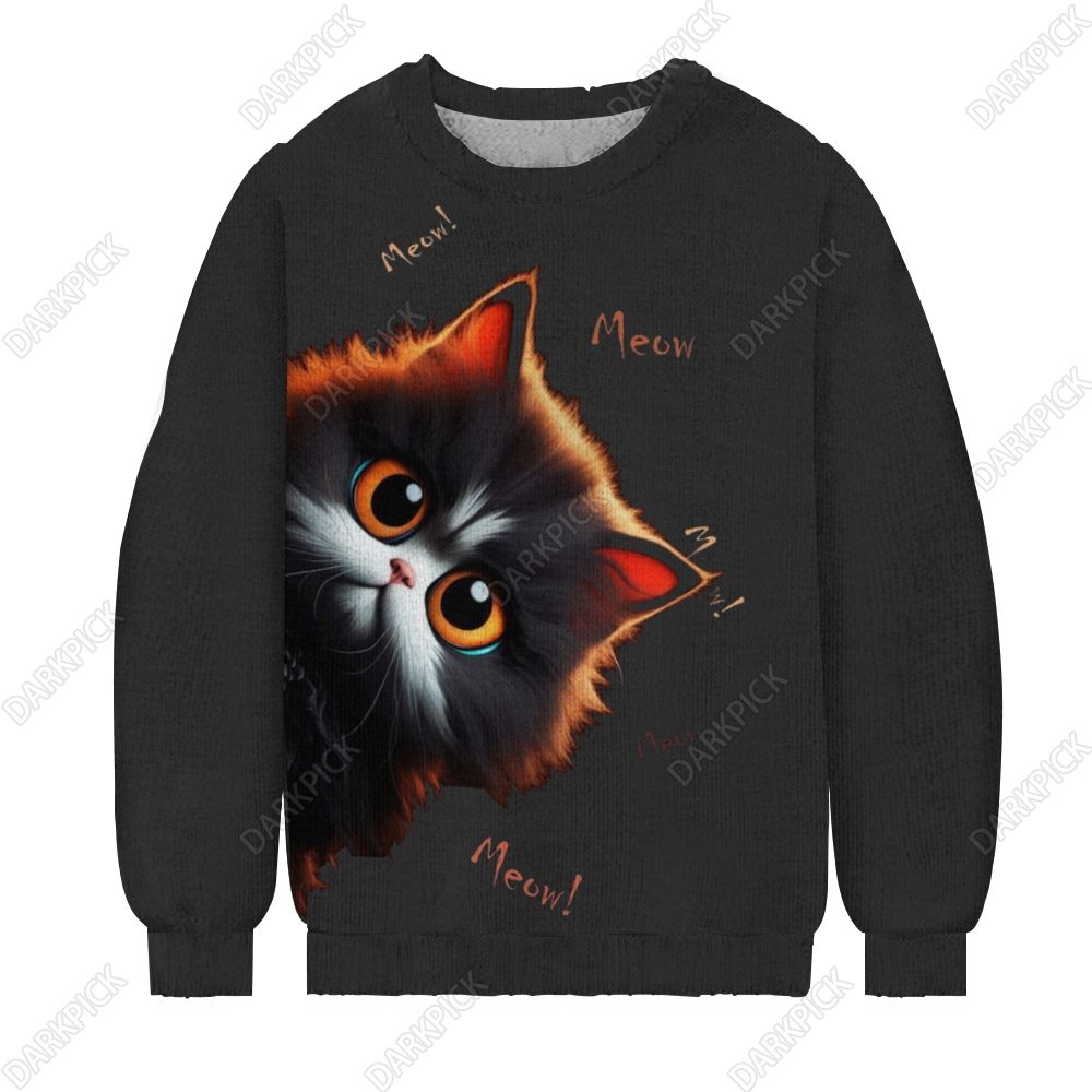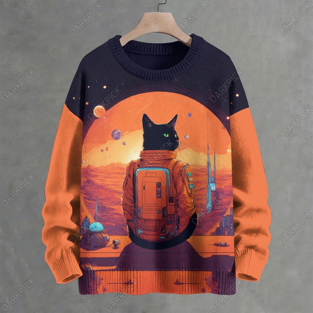 Men's Black Cat Print Casual Knit Crew Neck Sweater