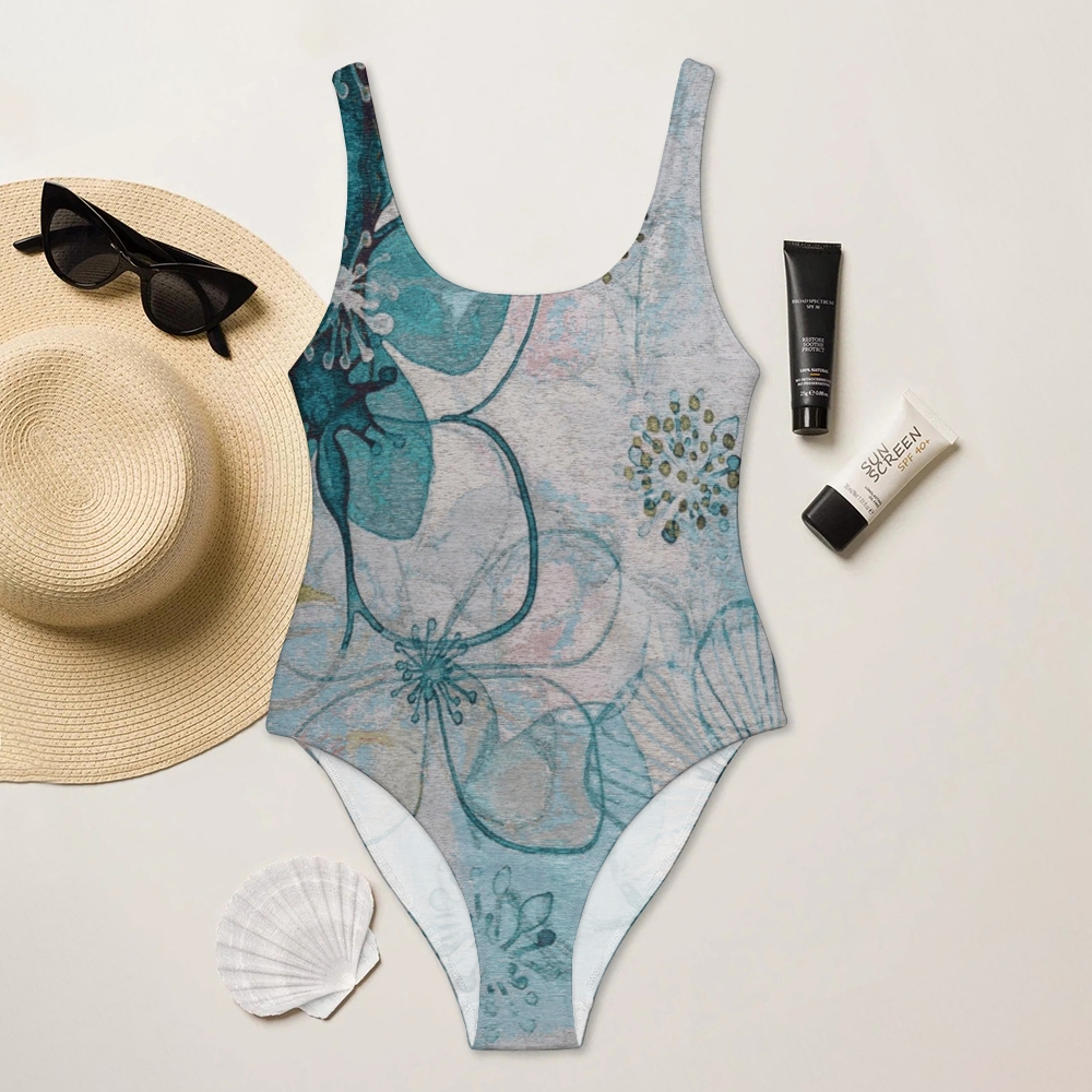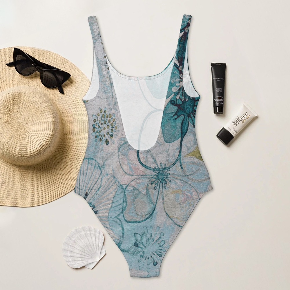Teal Floral Line Art Deep U-Back One-Piece Swimsuit