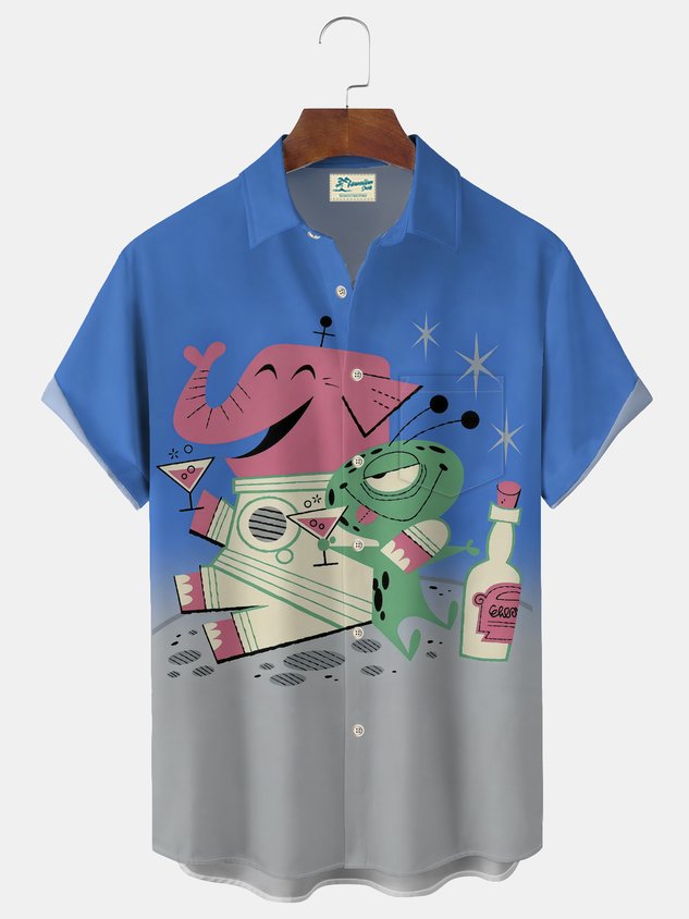 Royaura® Vintage Alien Cartoon Print Men's Casual Stylish Button Pocket Hawaiian Summer Shirts Short Sleeve Shirt Big Tall