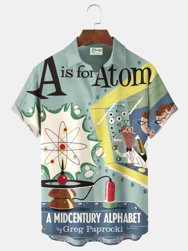 Royaura® Vintage Medieval Atomic Science Cartoon Print Men's Casual Stylish Button Pocket Short Sleeve Shirt Big Tall