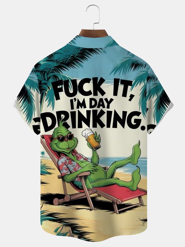 Royaura® Retro Cartoon Green Monster Vacation Print Men's Button Pocket Short-Sleeve Hawaiian Shirt Big & Tall