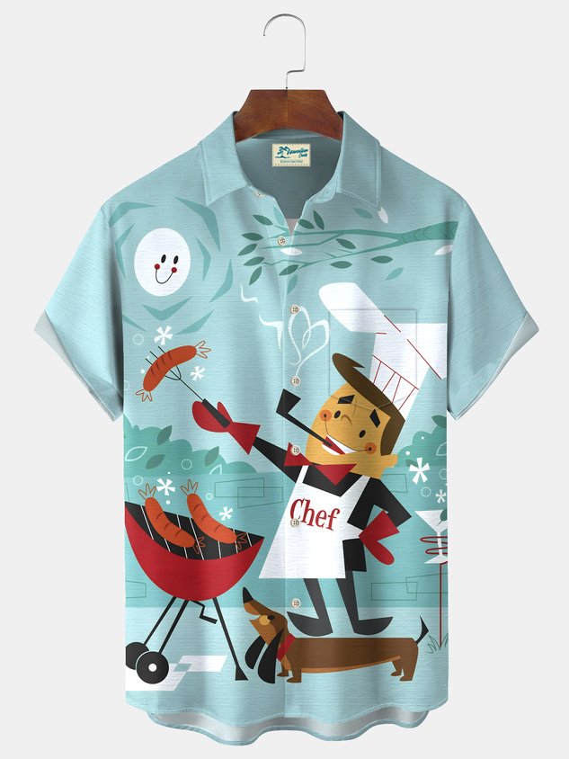 Darkpick® Vintage Cartoon Chef Print Men's Lapel Button Pocket Short Sleeve Shirt Big & Tall
