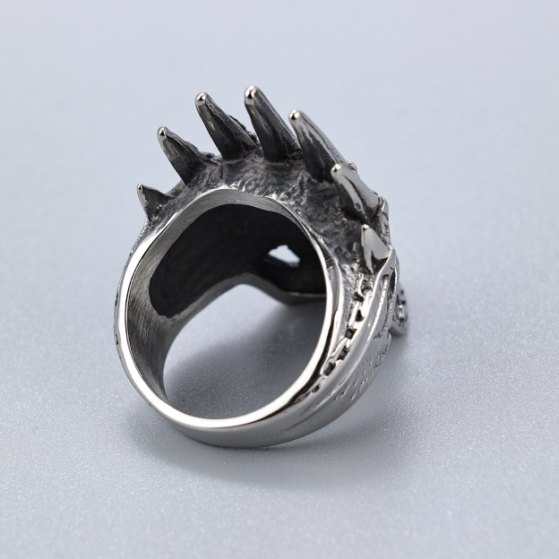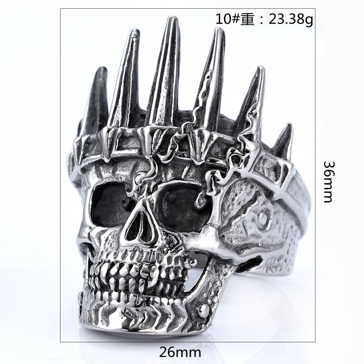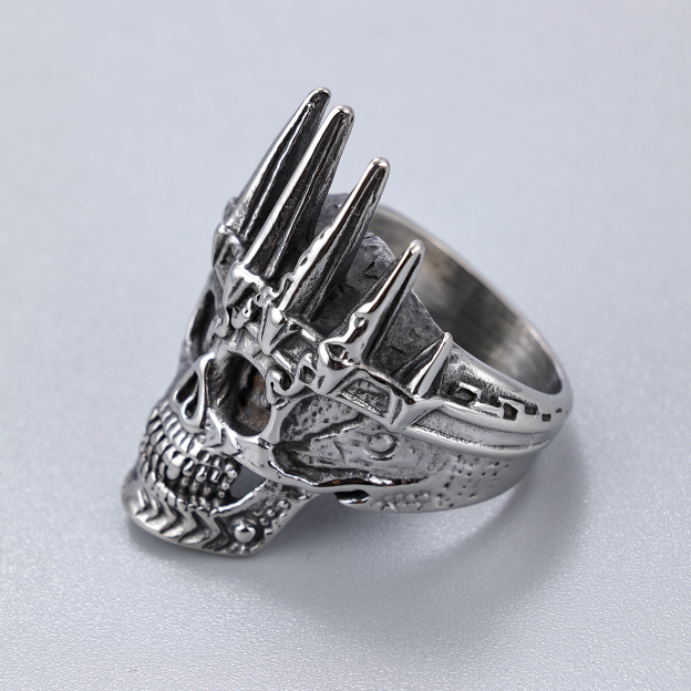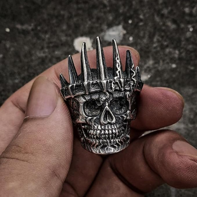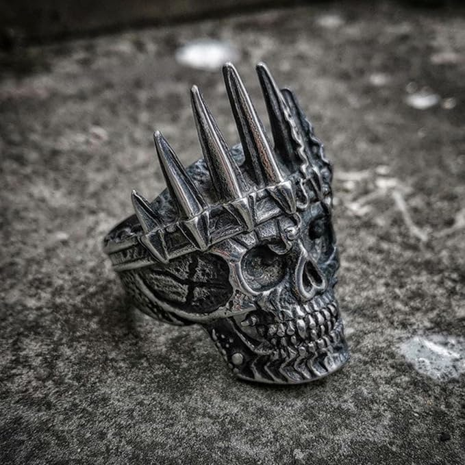 - Design and Patterns: The ring prominently showcases a detailed skull with hollowed-out eye sockets and a grimacing mouth. The skull is adorned with a crown-like structure featuring sharp spikes, giving it a regal yet menacing appearance. The surface of the ring has a textured finish, adding to its rugged and stylish look.