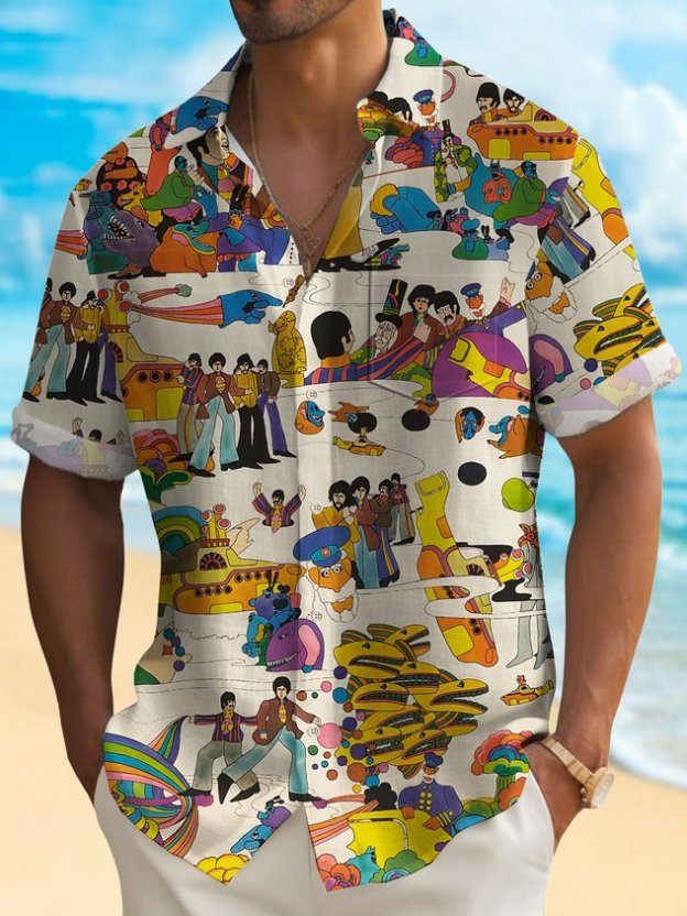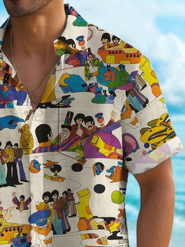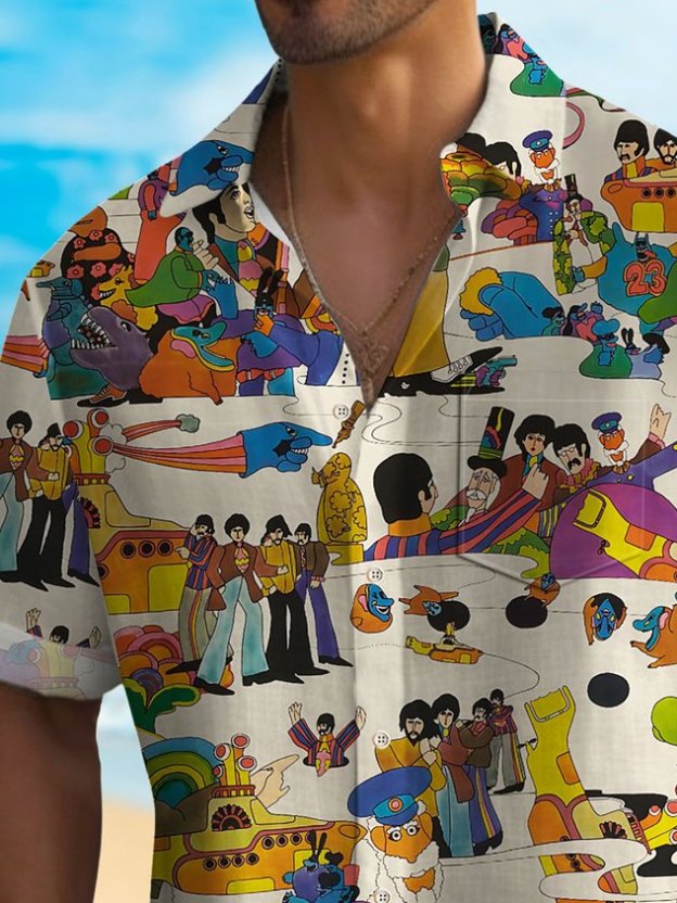 Darkpick® 50's Retro Cartoon Men's Music Shirt Stretch Quick Dry Camp Pocket Band Shirt Big Tall