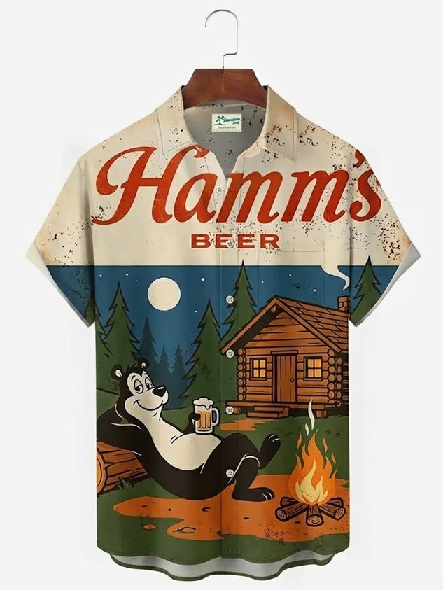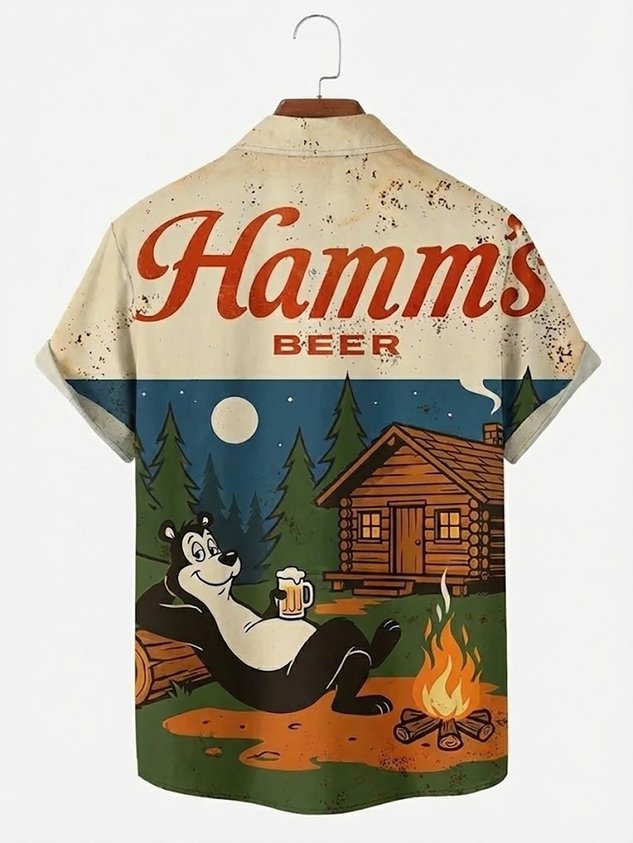 Royaura® Retro Fun Cartoon Beer Print Men's Button-Down Short-Sleeve Shirt Big & Tall