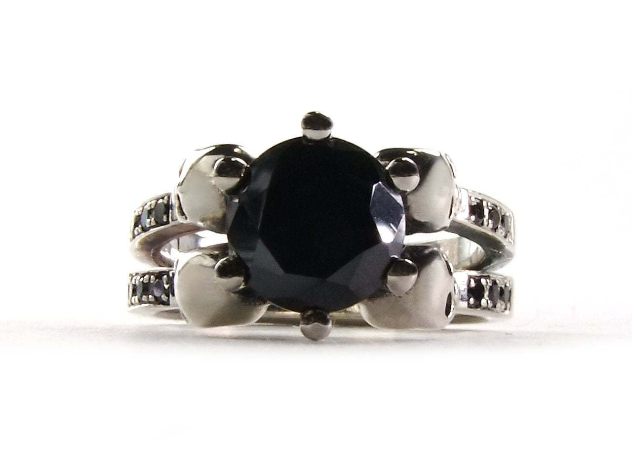 Made of solid sterling silver it features a 2ct 8mm all natural black spinel, surrounded by four hand carved skulls and twelve natural black diamonds in the bands for extra bling.