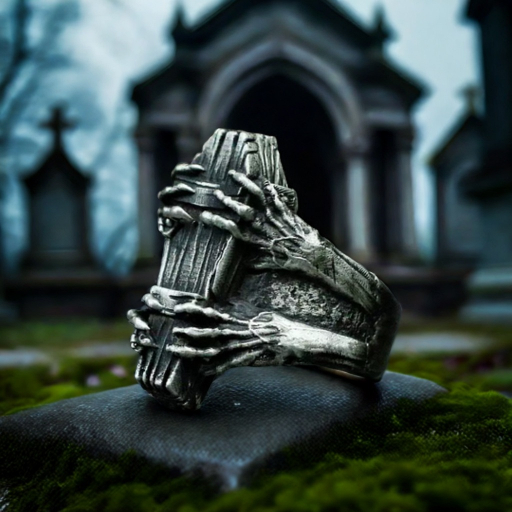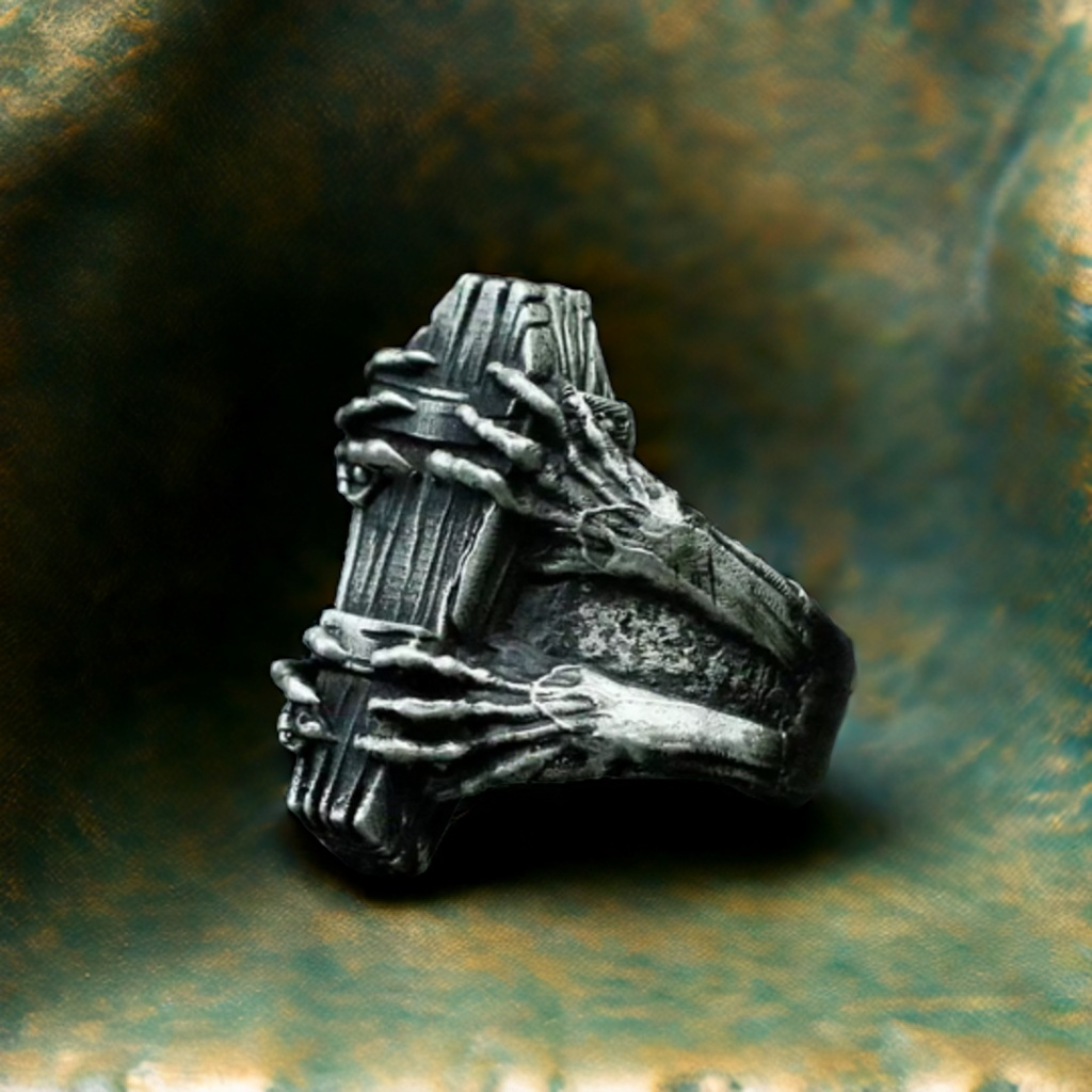 - Design and Patterns: The ring showcases a detailed coffin shape with intricate lines and textures to mimic the appearance of an old, weathered coffin. Skeleton hands are intricately carved, wrapping around the coffin, adding a macabre and gothic touch. The overall design is highly detailed and gives the ring a dark and mysterious aesthetic.