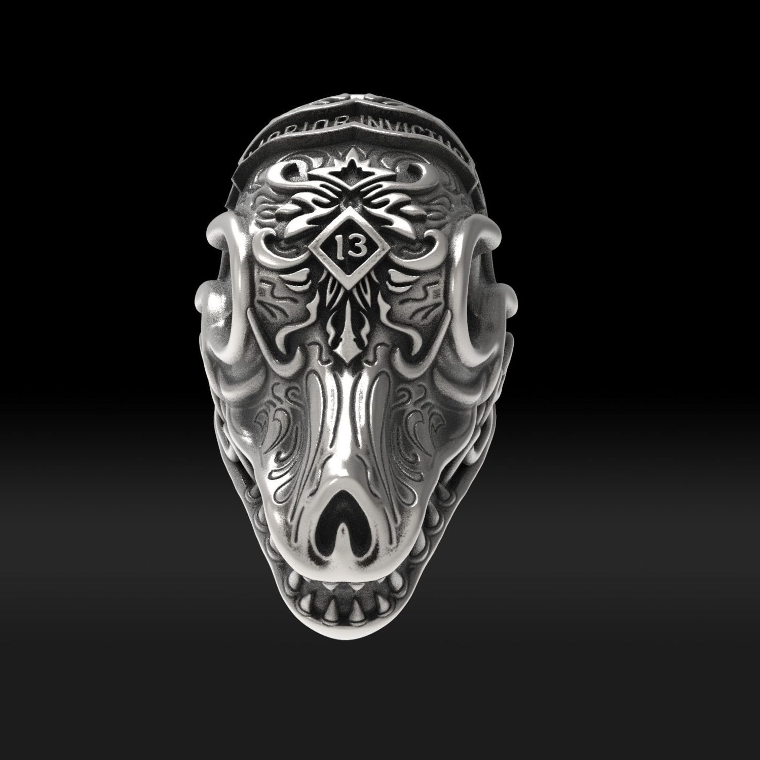 On the forehead of the skull is a striking "13" symbol, adding a mysterious touch. The word "INVICTUS" is engraved on the top, conveying an indomitable spirit. The chain - like decoration on the side of the ring is a unique design, further enhancing the overall cool and mysterious style.