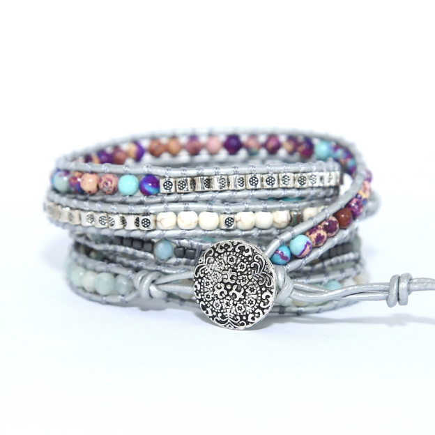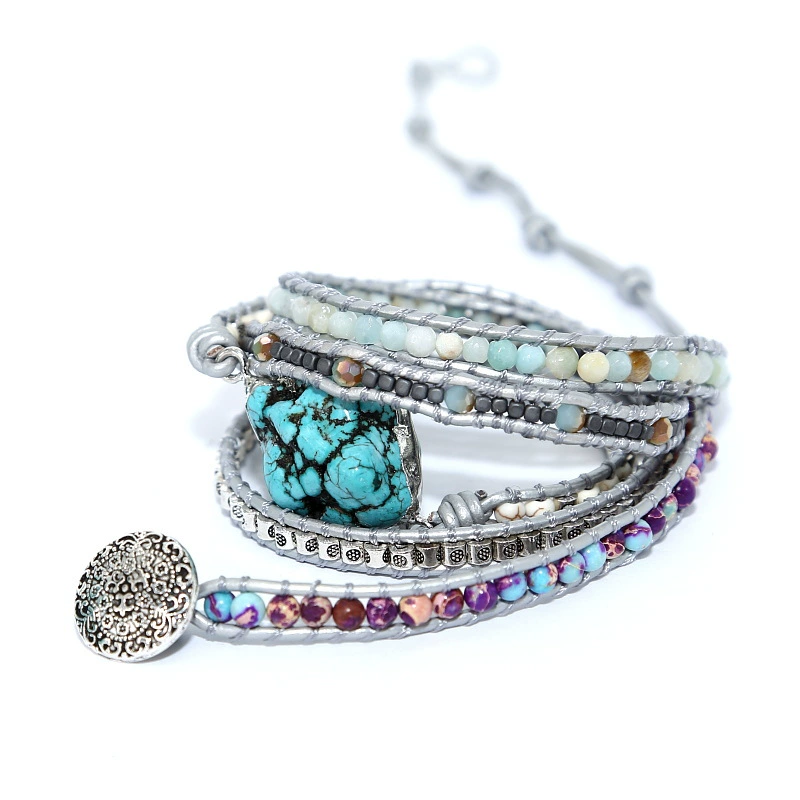 This bracelet showcases a multi-layer wrap design, using silver-grey braided cord as the base, meticulously stacked to create rich dimensionality. A large turquoise centerpiece takes the spotlight, its blue-green hue contrasting with natural black veining for a striking aesthetic. Surrounding it are beads of Imperial Jasper, Amazonite, and other gemstones, paired with metallic decorative accents and carefully detailed endings. With a chic, trendy style and handwoven finesse, it becomes an instant visual focal point when worn.