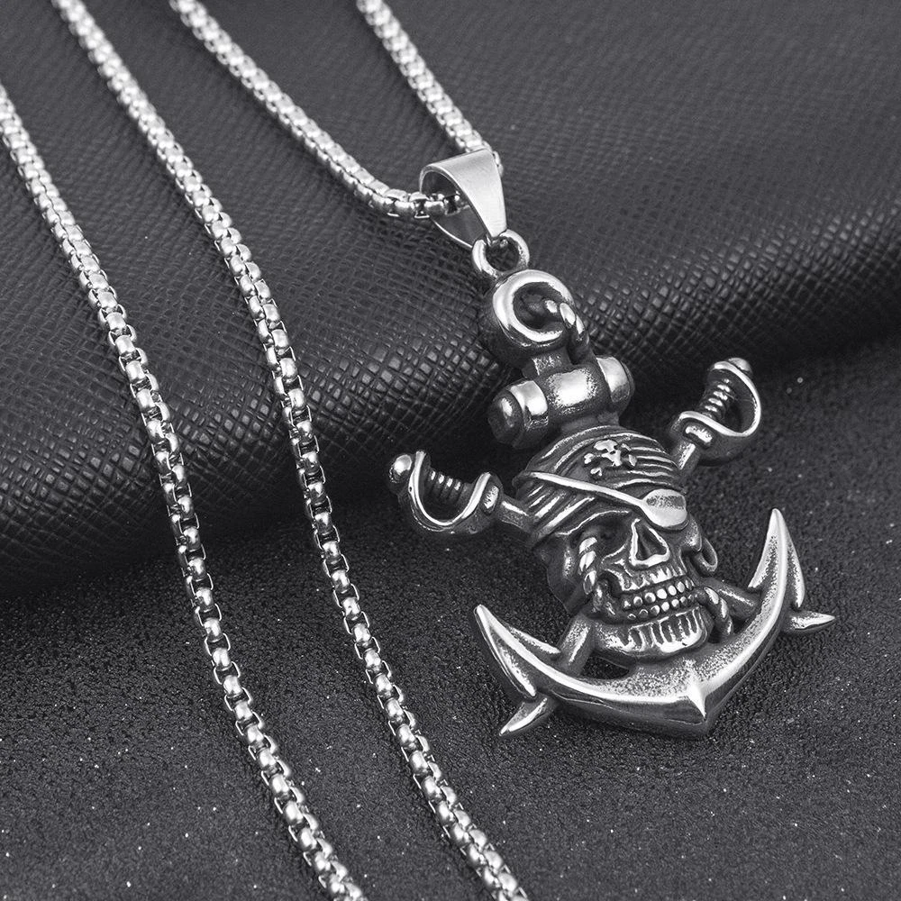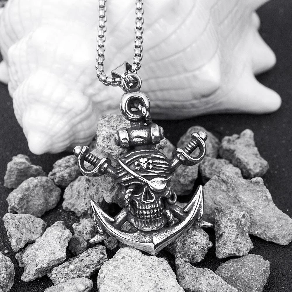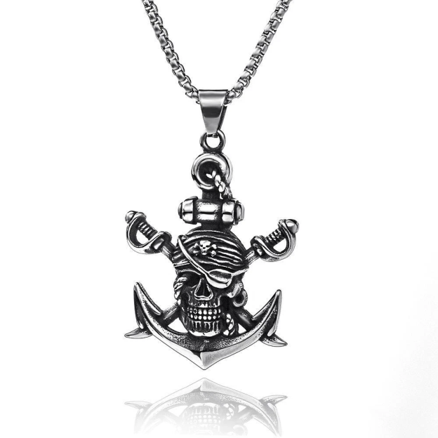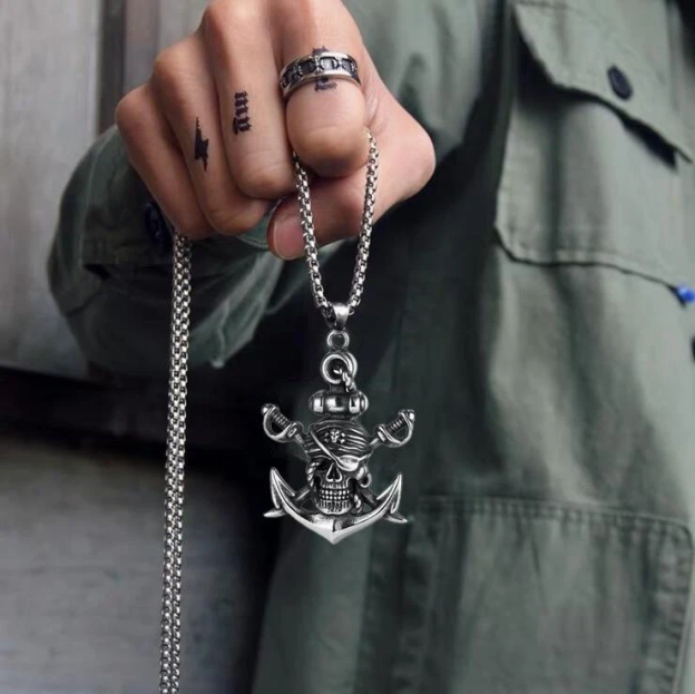 The design philosophy behind this necklace is to blend historical pirate symbolism with modern jewelry craftsmanship. By reimagining classic pirate icons—the skull, sword, and anchor—through detailed titanium steelwork, it creates a piece that honors the past while fitting seamlessly into contemporary fashion. The vintage aesthetic, combined with the durability of titanium steel, makes it a versatile accessory for those who appreciate both history and style. Whether worn as a nod to pirate lore or a bold fashion statement, the necklace captures the spirit of adventure and rebellion.