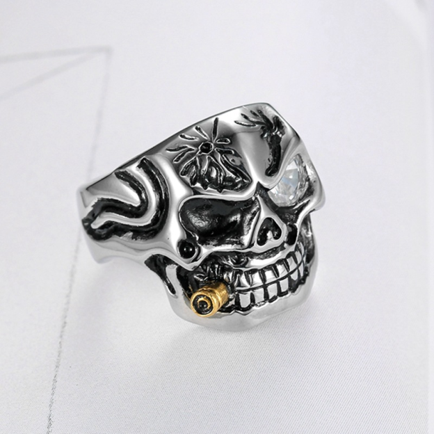 - Skull Design: The ring prominently showcases a detailed skull with a white eye (likely a crystal or gemstone) and a golden pipe inserted in its mouth. The skull has intricate carvings, including spider-like patterns on the forehead and other decorative elements, giving it a menacing and unique look.