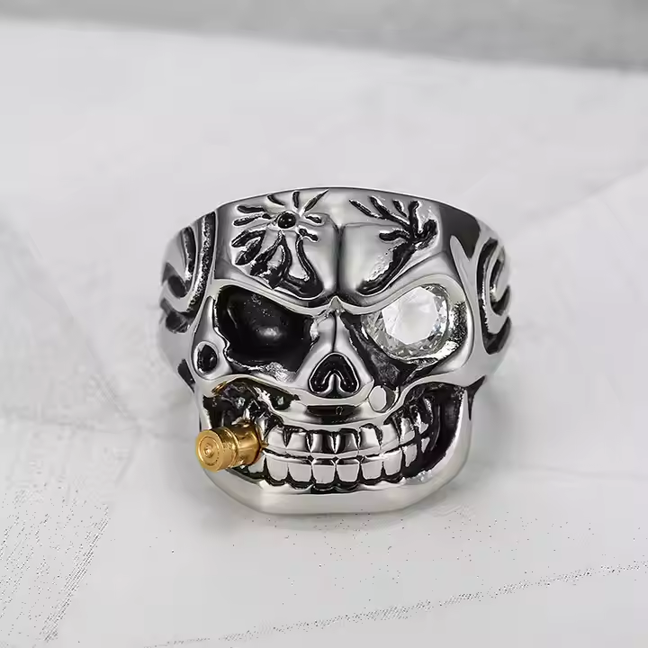 Overall, the White-eyed Golden Pipe Titanium Steel Skull Ring is a standout piece that combines elements of edgy design and durable materials, making it a popular choice among those who seek to express their individuality through their accessories.