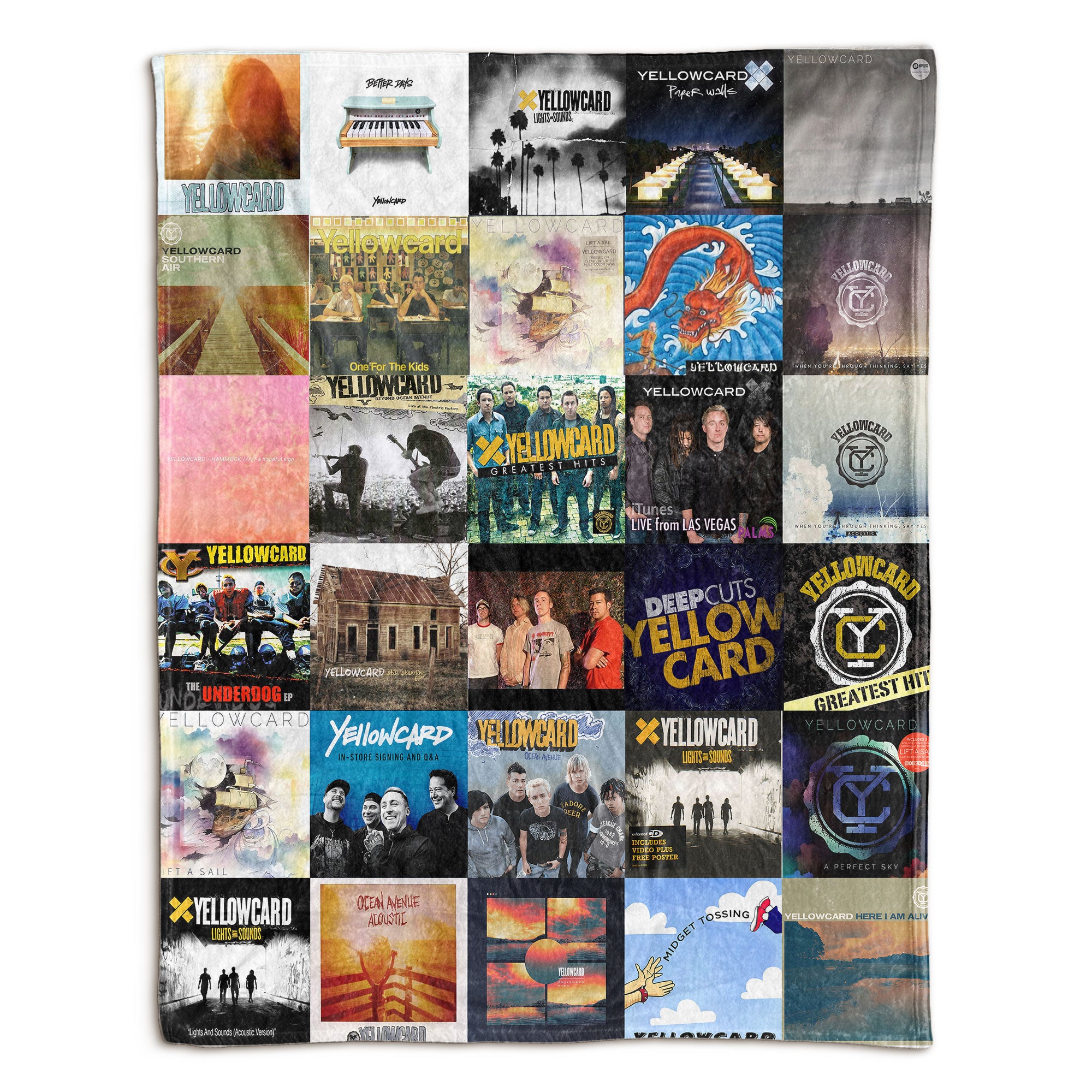 This blanket brings back the rush of summer nights, skate-park anthems, and the violin-charged melodies that made Yellowcard unforgettable. Every panel is a trip through the albums that shaped a generation—moments of youth, heartbreak, and hope preserved in one cozy collage. A perfect way to wrap yourself in the soundtrack of your coming-of-age years.
